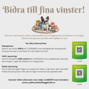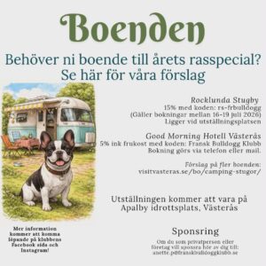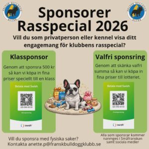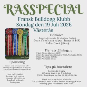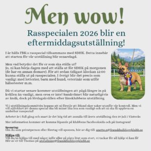 Information från MopsOrden! Bjuder in till ett samarbete med Fransk Bulldogg klubb, där vi gemensamt får tillfället att prova på Viltspår som aktivering i en skog i Åkersberga 1 majKlicka här för mer information som finns på FB Bjuder in Fransk Bulldogg & Engelsk Bulldogg till ett gemensamt RFG-S Test i Skellefteå, Ersmark 2 maj & i Umeå, Teg 3 majKlicka här för mer information som finns på FB